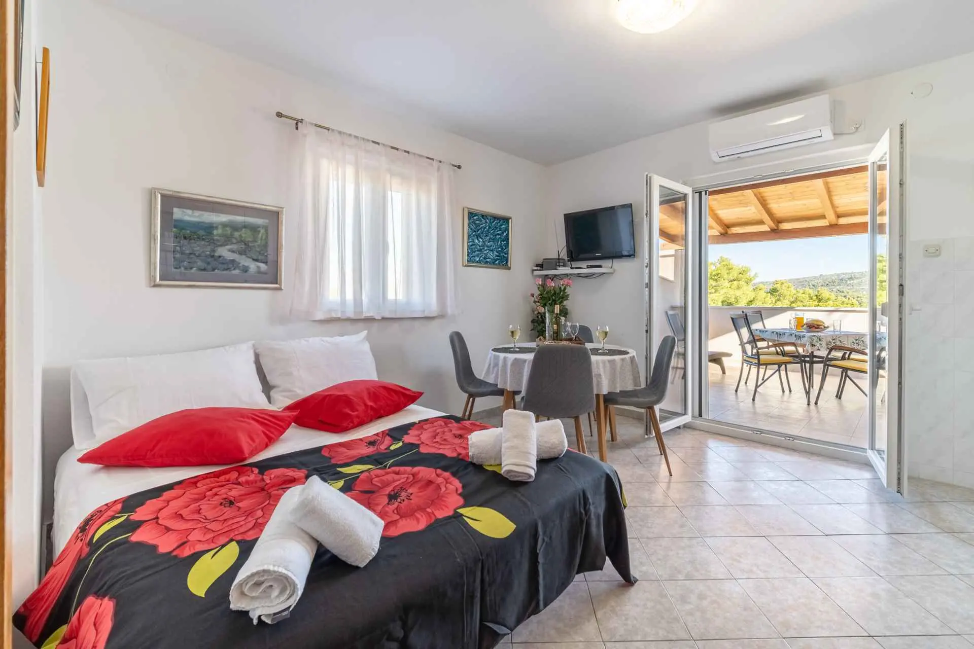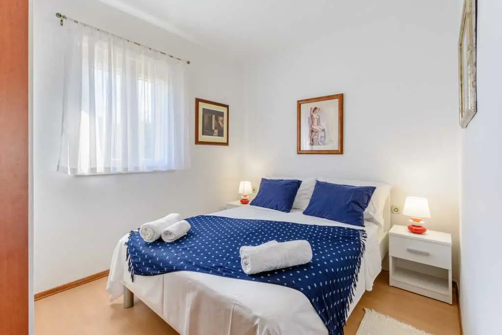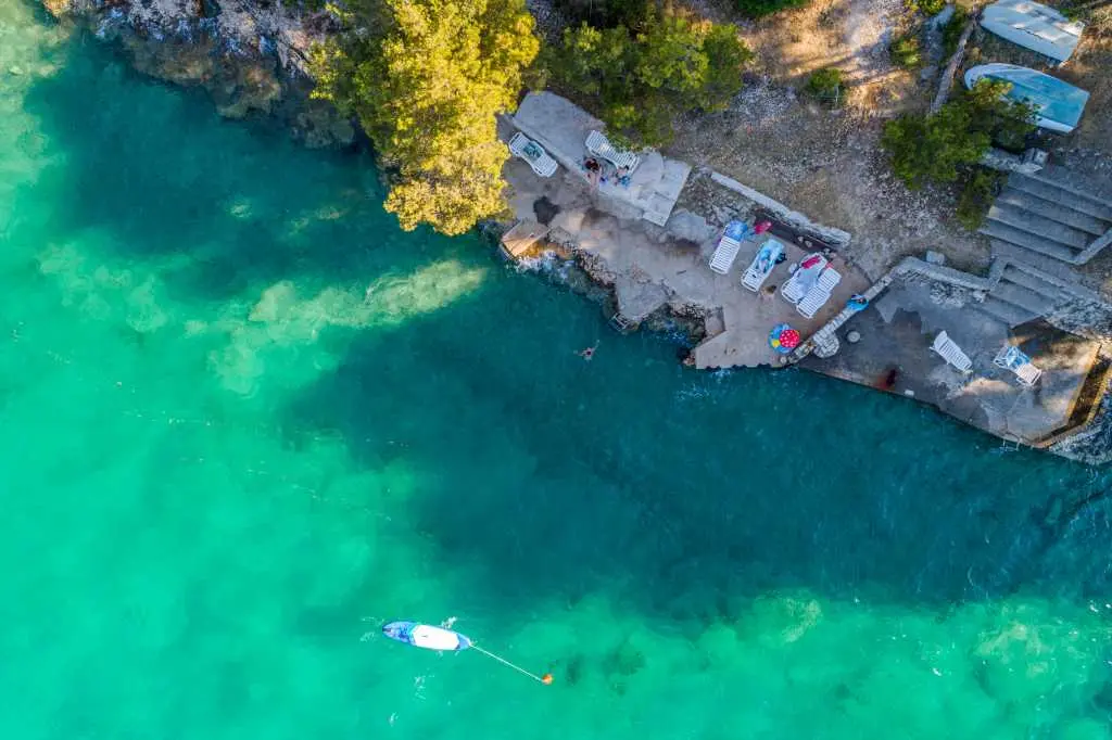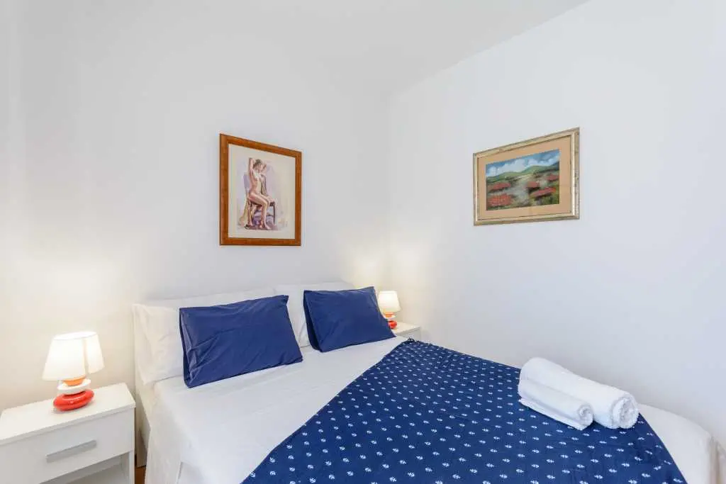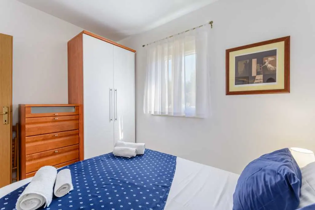 Vill du tillbringa en trevlig och stressfri semester? Hitta en lugn, lugn och vacker vik omgiven av tallskogar och ett blått kristallklart hav? Du är på rätt plats! Du kommer att uppleva ett paradis som du aldrig kommer att glömma. Kom och se själv! I familjehuset på första våningen finns en fin lägenhet på 40 m2. Från balkongen är det magnifik utsikt över havet genom tallskogen. Modernt utrustat kök och stort vardagsrum där är en dubbelsäng gör utrymmet mycket bekvämt. Sovrum, hall och badrum är delar av lägenheten som rymmer en familj med ett eller två barn. Området runt huset är omgivet av olivträd och medelhavsväxter och fungerar som en parkeringsplats. Det finns en grill som gästerna kan använda efter behag.