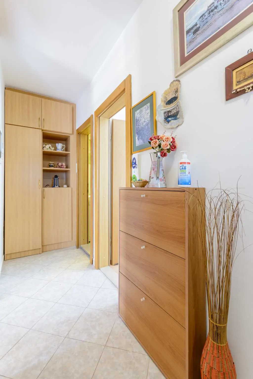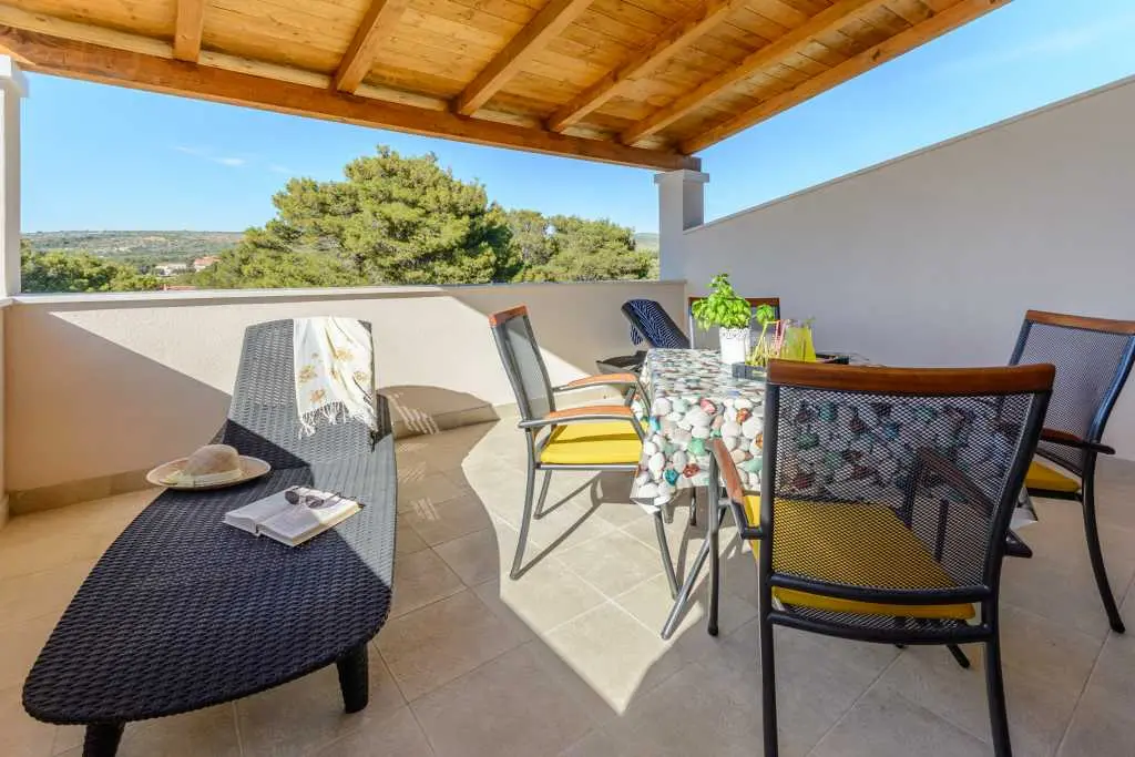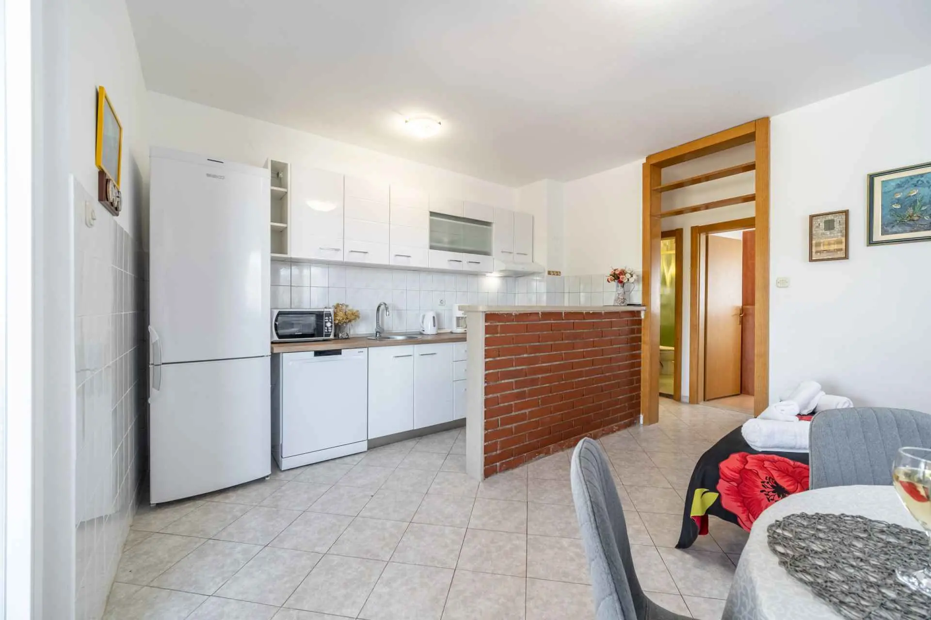 Vill du tillbringa en trevlig och stressfri semester? Hitta en lugn, lugn och vacker vik omgiven av tallskogar och ett blått kristallklart hav? Du är på rätt plats! Du kommer att uppleva ett paradis som du aldrig kommer att glömma. Kom och se själv! I familjehuset på första våningen finns en fin lägenhet på 40 m2. Från balkongen är det magnifik utsikt över havet genom tallskogen. Modernt utrustat kök och stort vardagsrum där är en dubbelsäng gör utrymmet mycket bekvämt. Sovrum, hall och badrum är delar av lägenheten som rymmer en familj med ett eller två barn. Området runt huset är omgivet av olivträd och medelhavsväxter och fungerar som en parkeringsplats. Det finns en grill som gästerna kan använda efter behag.