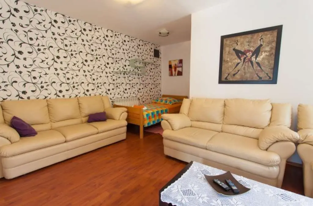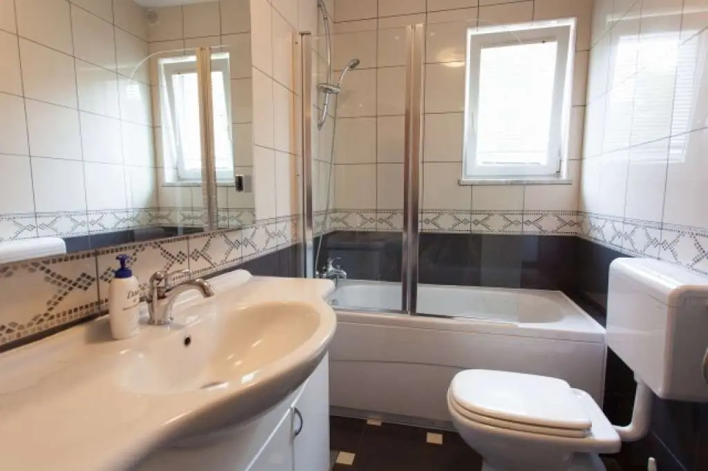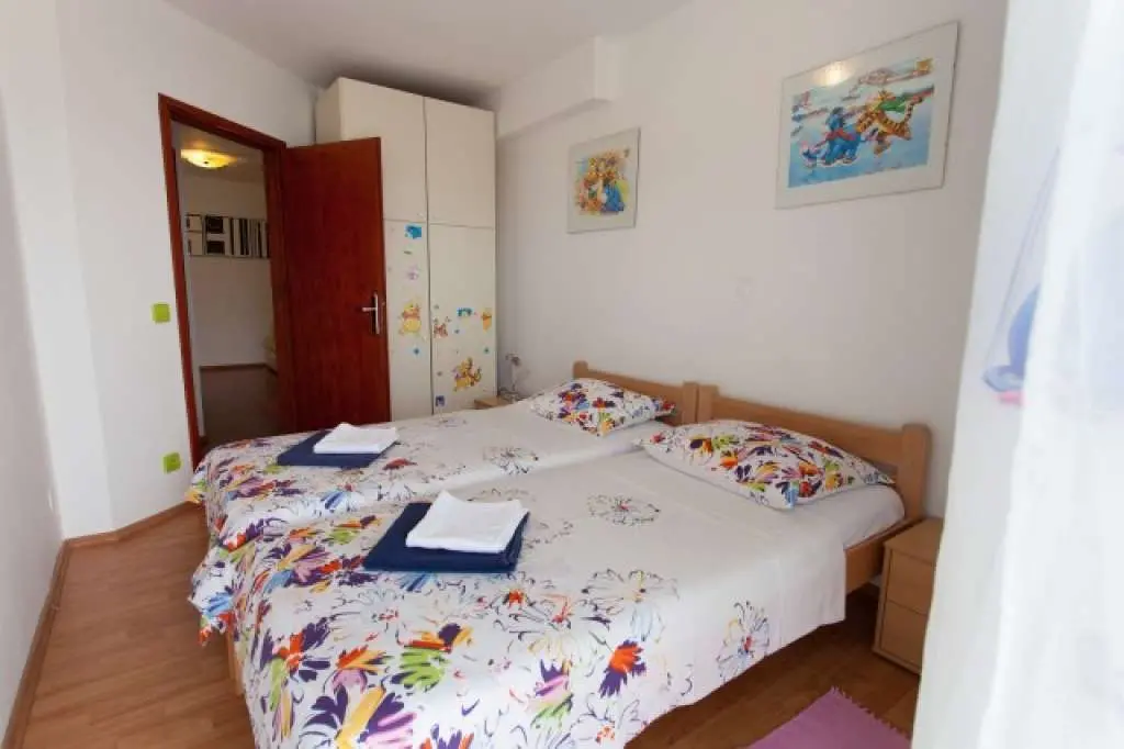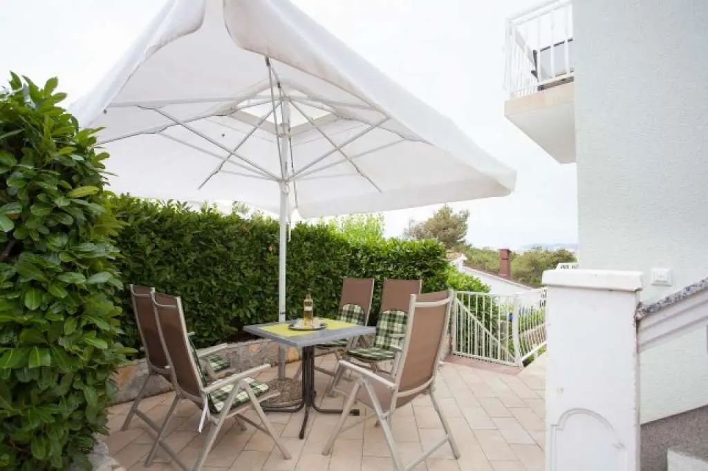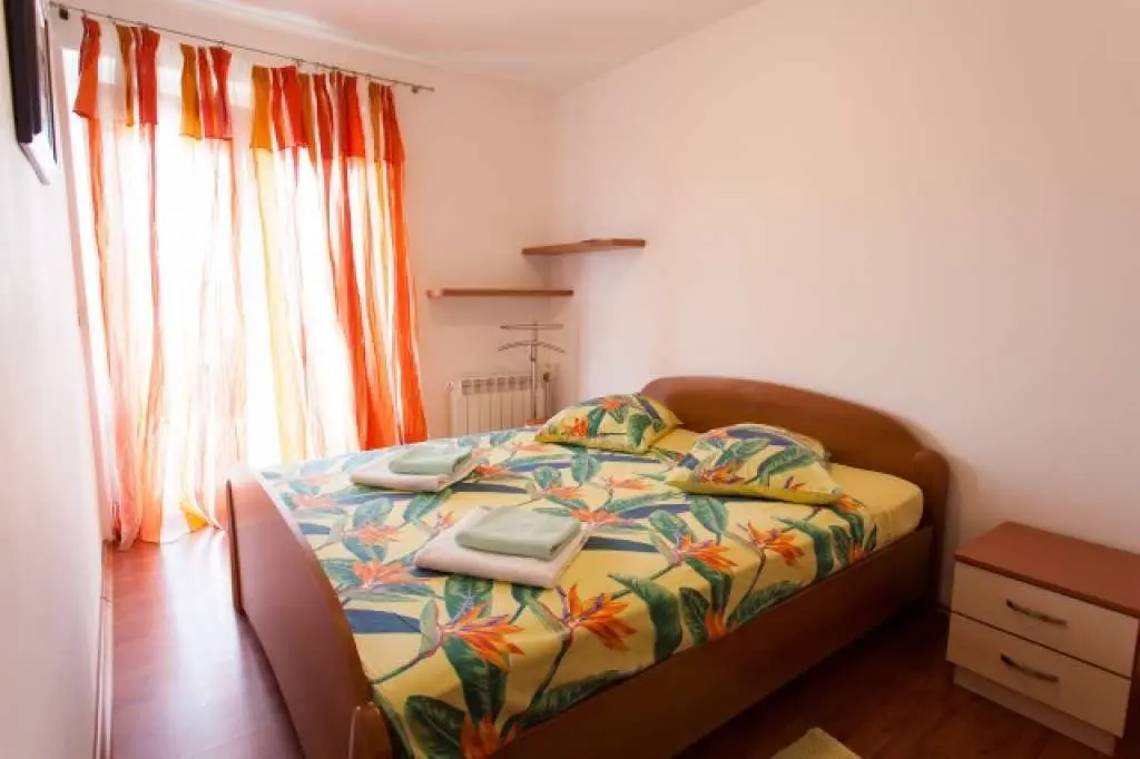 Villa i ett lugnt läge. Mycket lämplig för familjer som vill tillbringa en lugn semester. Lägenheten har en vacker terrass som har vacker havsutsikt, där du kan äta frukost och under natten sitta och koppla av med fin utsikt. Huset ligger nära stranden, så du kan gå till stranden. På stranden finns duschar.