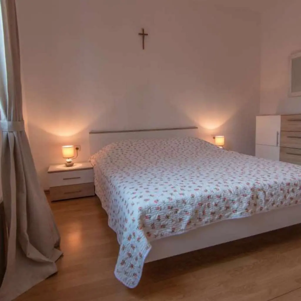 Lägenheten ligger på första våningen i en byggnad intill ett par lägenheter. Det är 10-15 minuters promenad från Mali Losinjs centrum. Stranden ligger 300 meter bort. Lägenheten består av: - Ett sovrum med dubbelsäng - Ett sovrum med två separata sängar; detta rum har utgång till verandan där det finns två extrasängar för två personer, - Ett vardagsrum - Två badrum - Ett kök - En matsal med utgång till den stora terrassen med vacker utsikt över havet Lägenheten har luftkonditionering och WiFi. Till denna lägenhet hör en gratis parkeringsplats. Husdjur är inte tillåtna. Ankomst – vilken dag som helst.