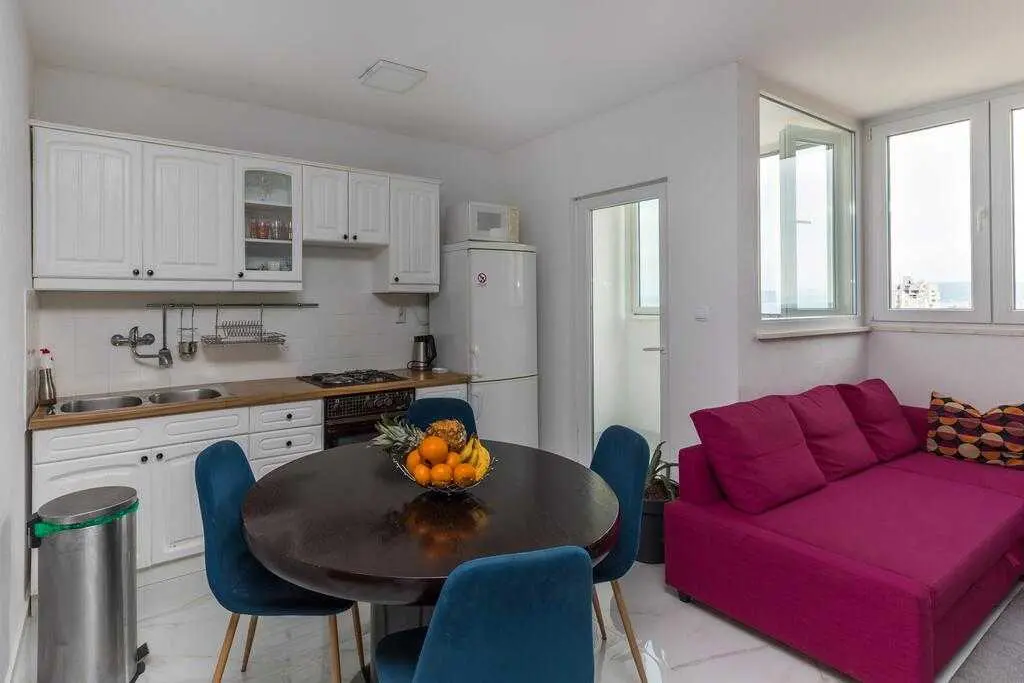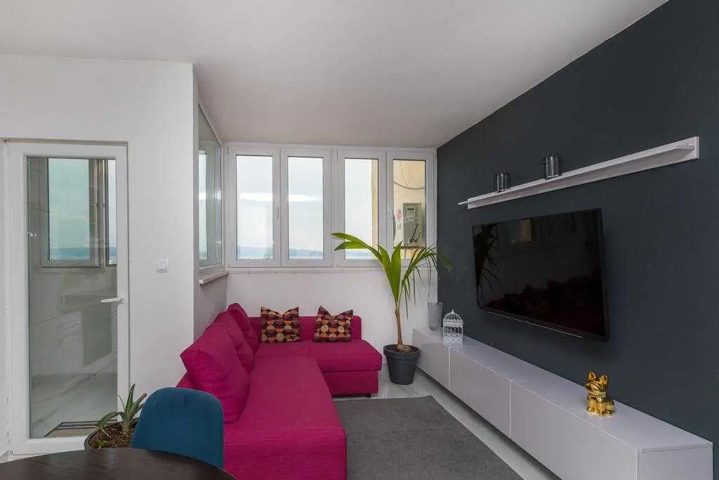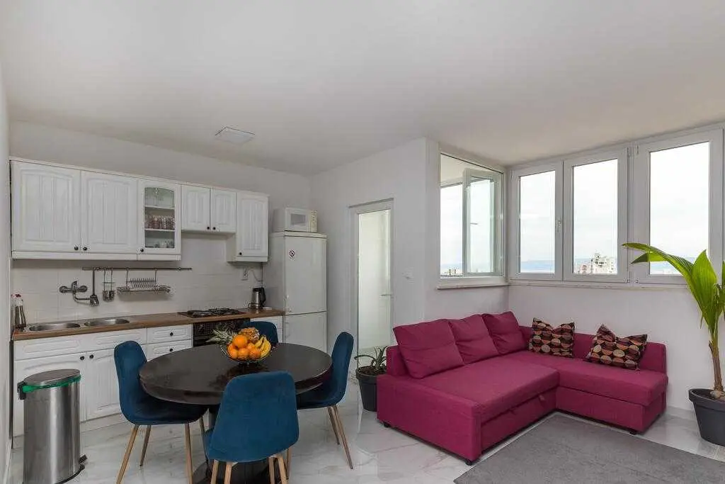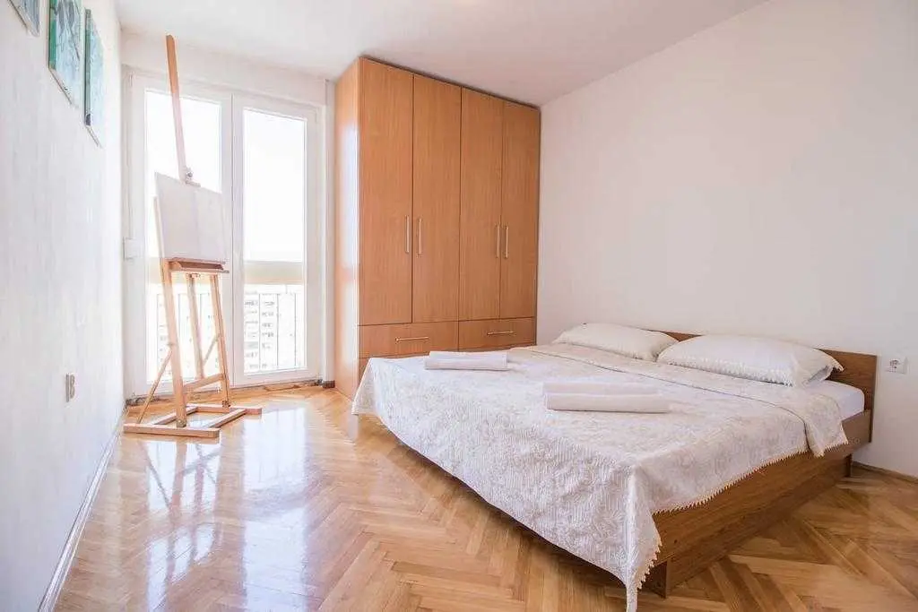 Lägenhet nära centrum, bort från stadens rörelse. Den har 2 stora rum, ett vardagsrum och kök med matsal, en balkong med sittmöbler. Från balkongen, köket och vardagsrummet har du en fantastisk utsikt över havet och ön Brač. Det ligger i bostadsdelen i Split - 25 minuters promenad från stadens centrum och 15 minuter till stadens stränder. Några minuter bort ligger det stora köpcentret, restauranger, kaféer och marknader. Den delen av staden är en av lokalbefolkningens favoriter. Ett rum med dubbelsäng kan delas upp för att göra två enkelsängar.