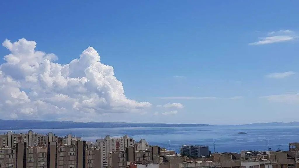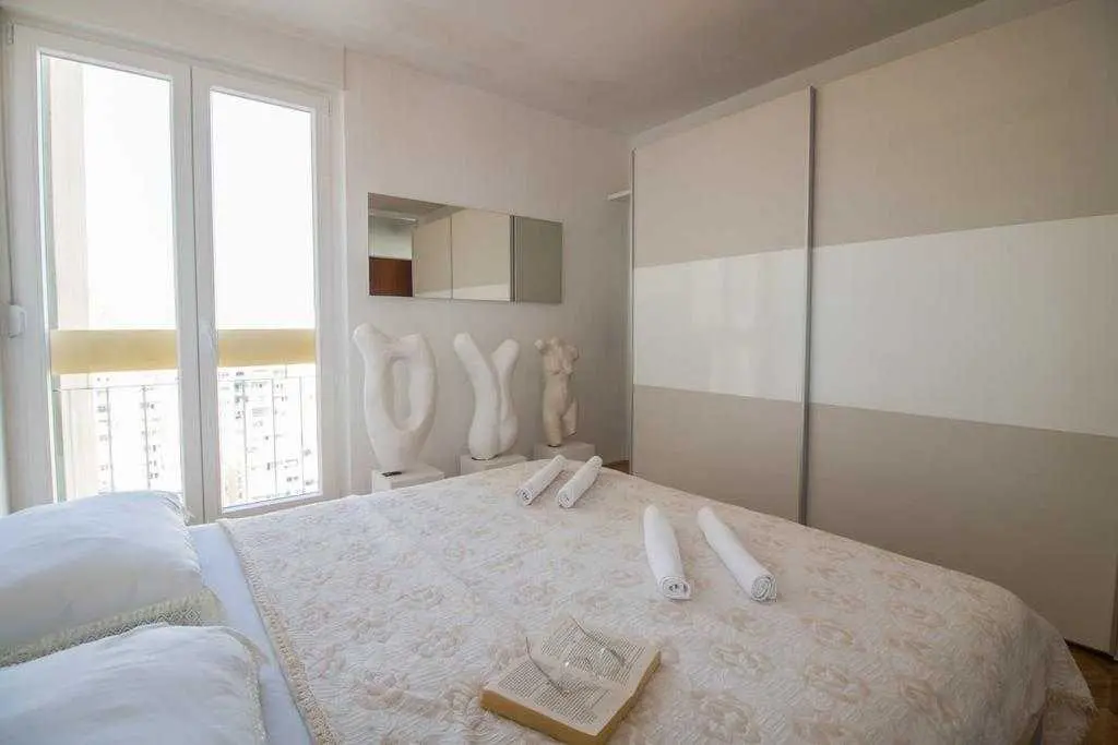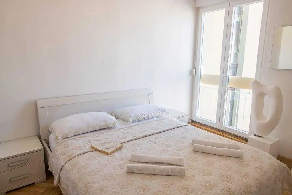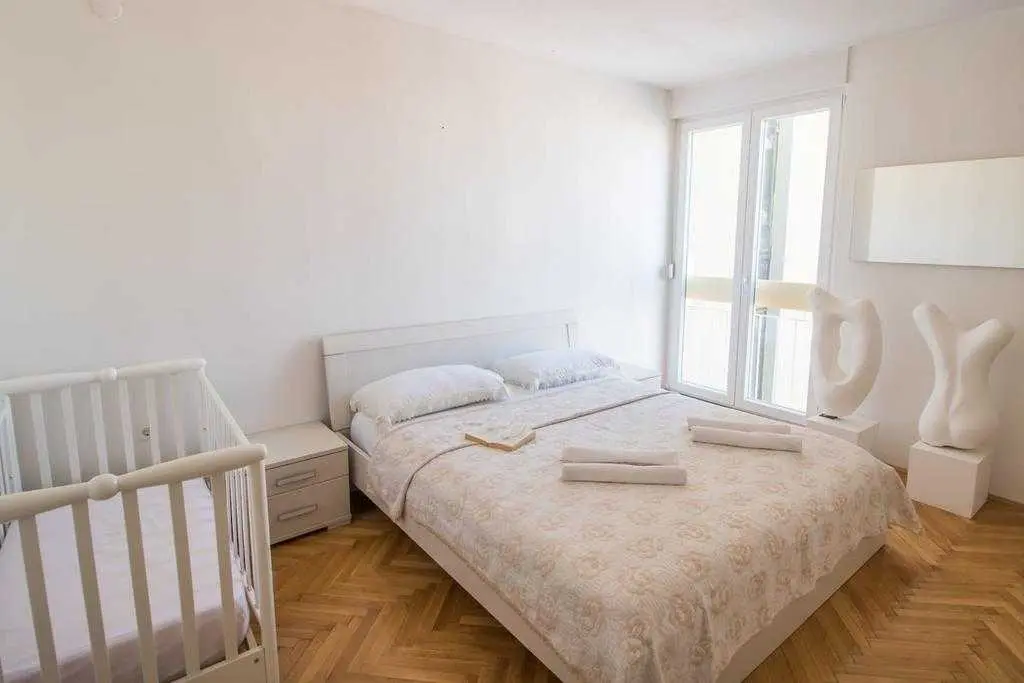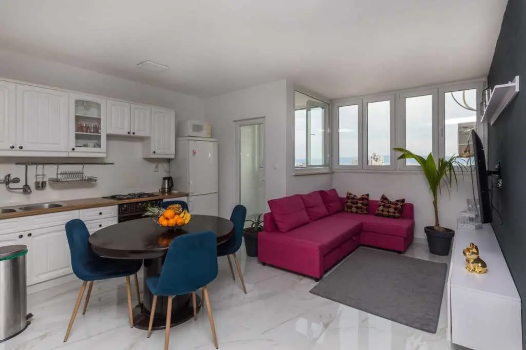 Lägenhet nära centrum, bort från stadens rörelse. Den har 2 stora rum, ett vardagsrum och kök med matsal, en balkong med sittmöbler. Från balkongen, köket och vardagsrummet har du en fantastisk utsikt över havet och ön Brač. Det ligger i bostadsdelen i Split - 25 minuters promenad från stadens centrum och 15 minuter till stadens stränder. Några minuter bort ligger det stora köpcentret, restauranger, kaféer och marknader. Den delen av staden är en av lokalbefolkningens favoriter. Ett rum med dubbelsäng kan delas upp för att göra två enkelsängar.